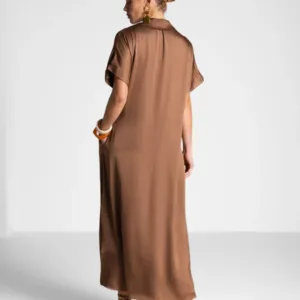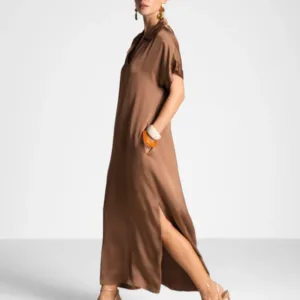 Combining relaxed ease with refined design, this kaftan dress is crafted from luxurious Italian satin that drapes beautifully over the body. The collared neckline adds a polished touch, while side splits enhance the fluid silhouette. The loose, flowing fit makes it a versatile piece for both casual days and elevated evenings.